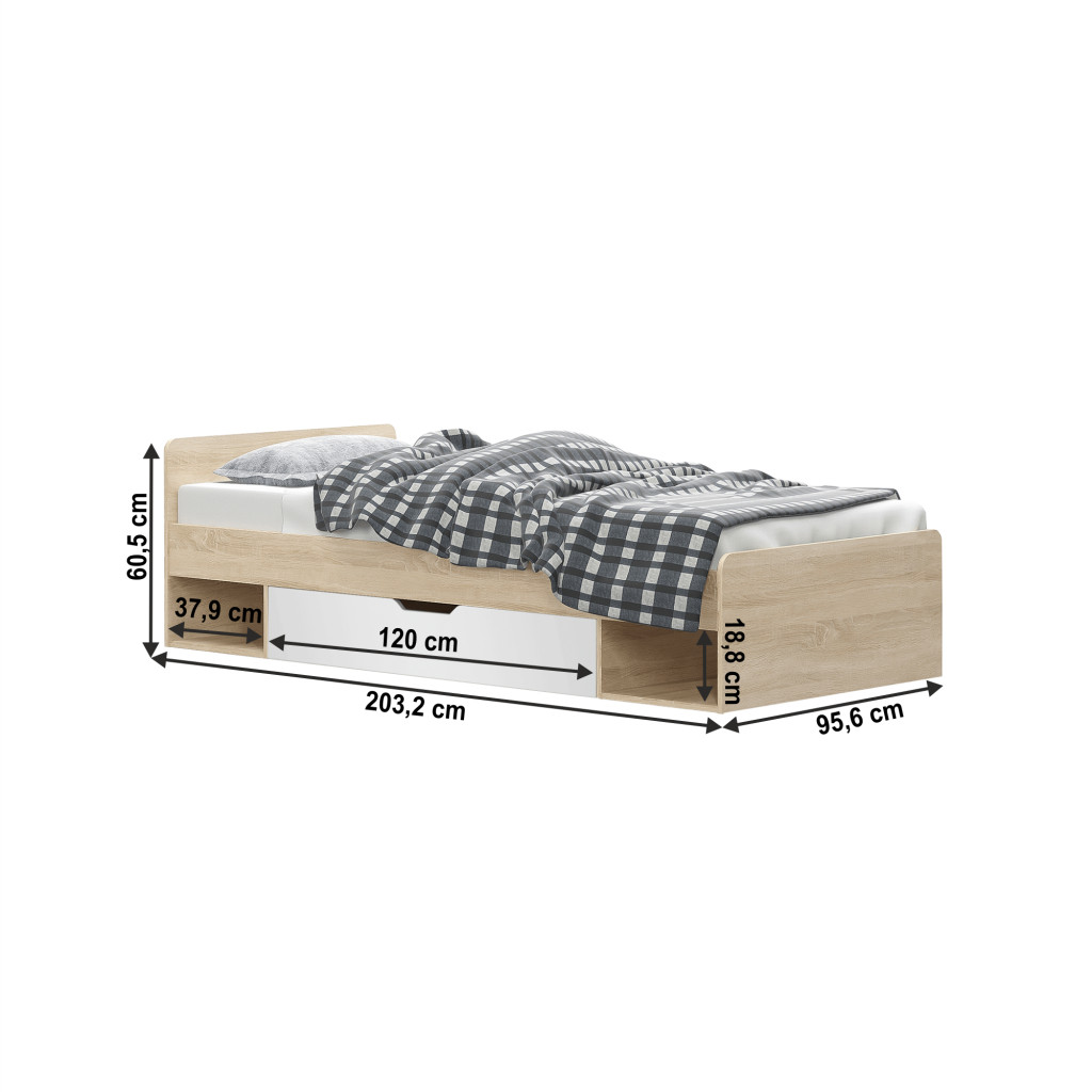 Ez a TEYO ágy elegáns fehér és tölgy sonoma színkombinációban kapható, amely tökéletes választás bármilyen stílusú hálószobába. A 90x200 cm-es fekvőfelület kényelmes alvást biztosít. Praktikus, helytakarékos kialakítású, mivel rendelkezik tárolási lehetőséggel és az éjjeli szekrény tetszőlegesen áthelyezhető az ágy mindkét oldalára.