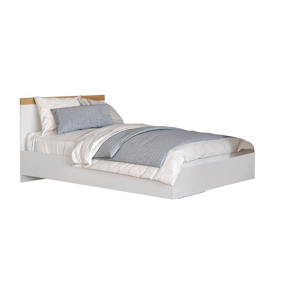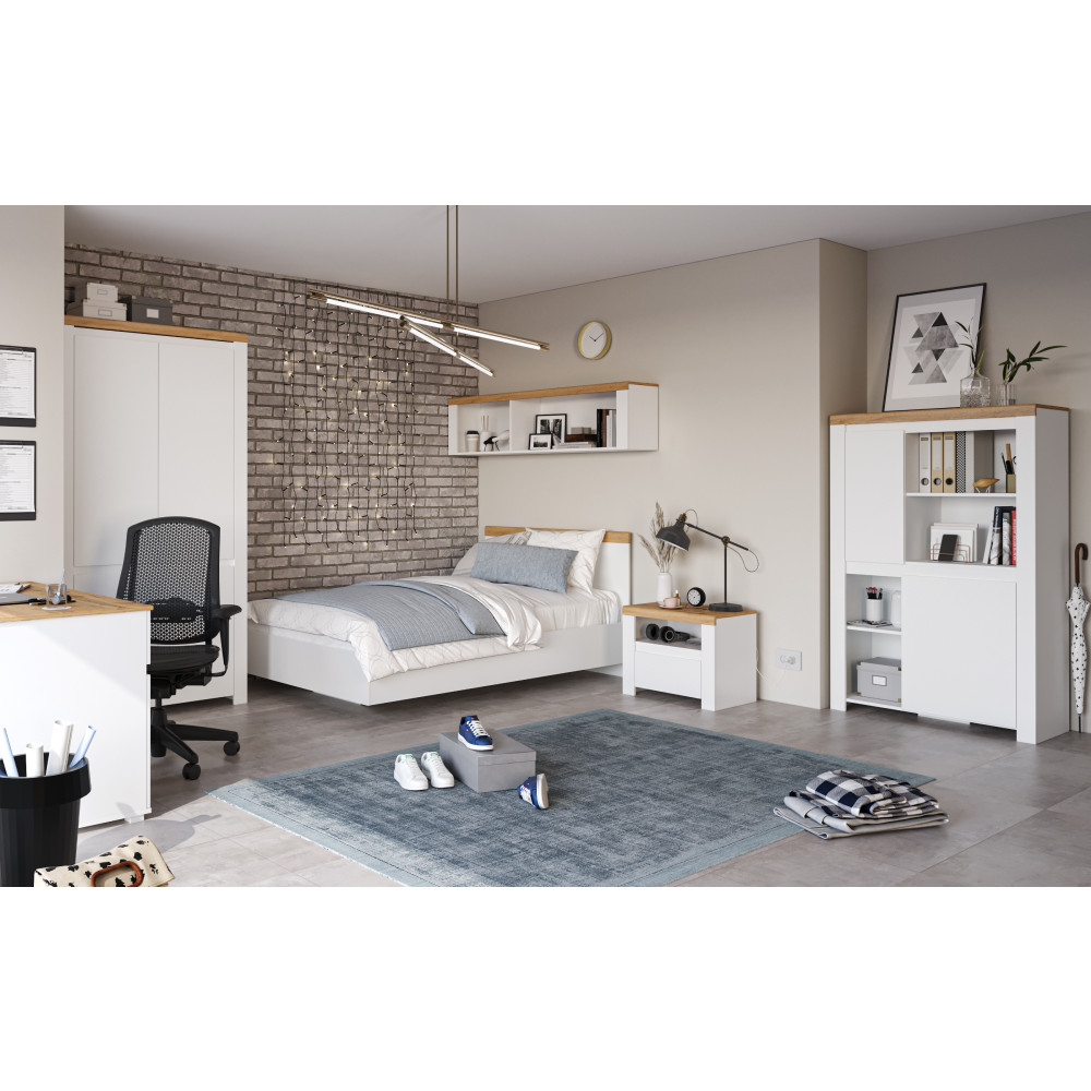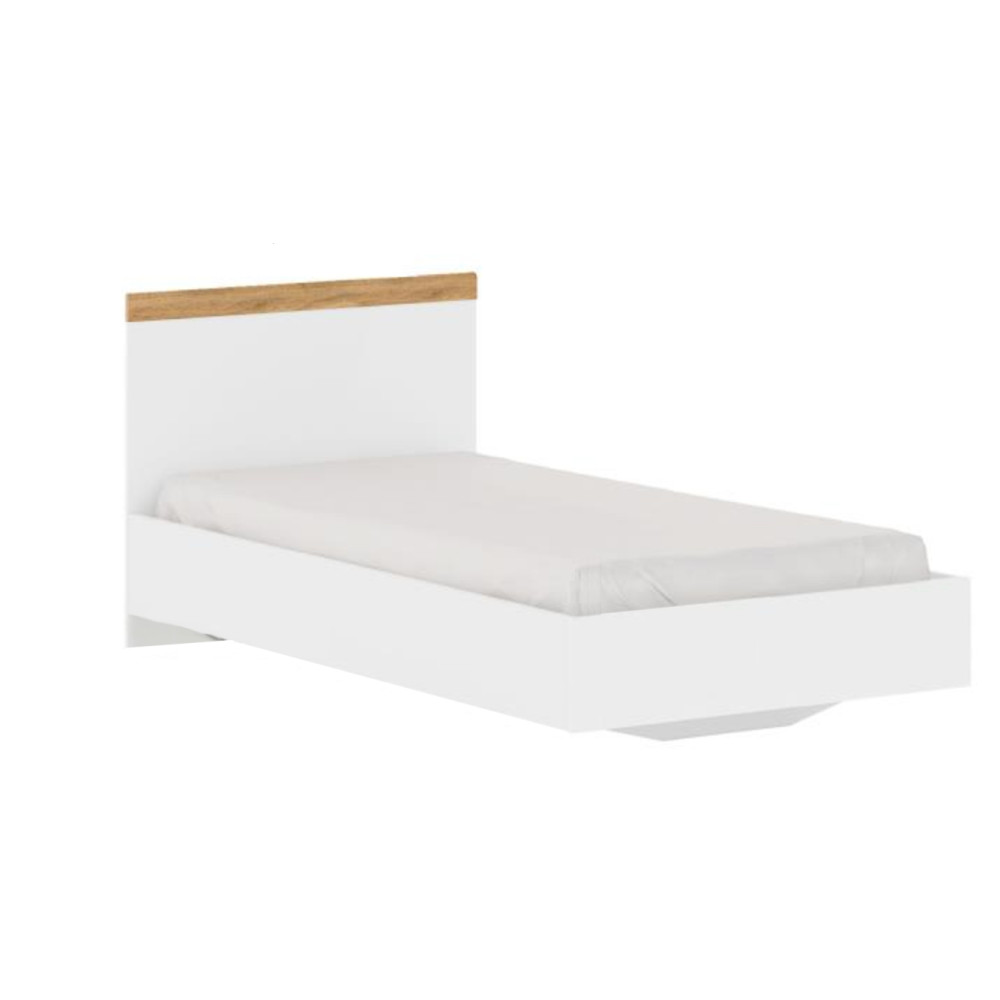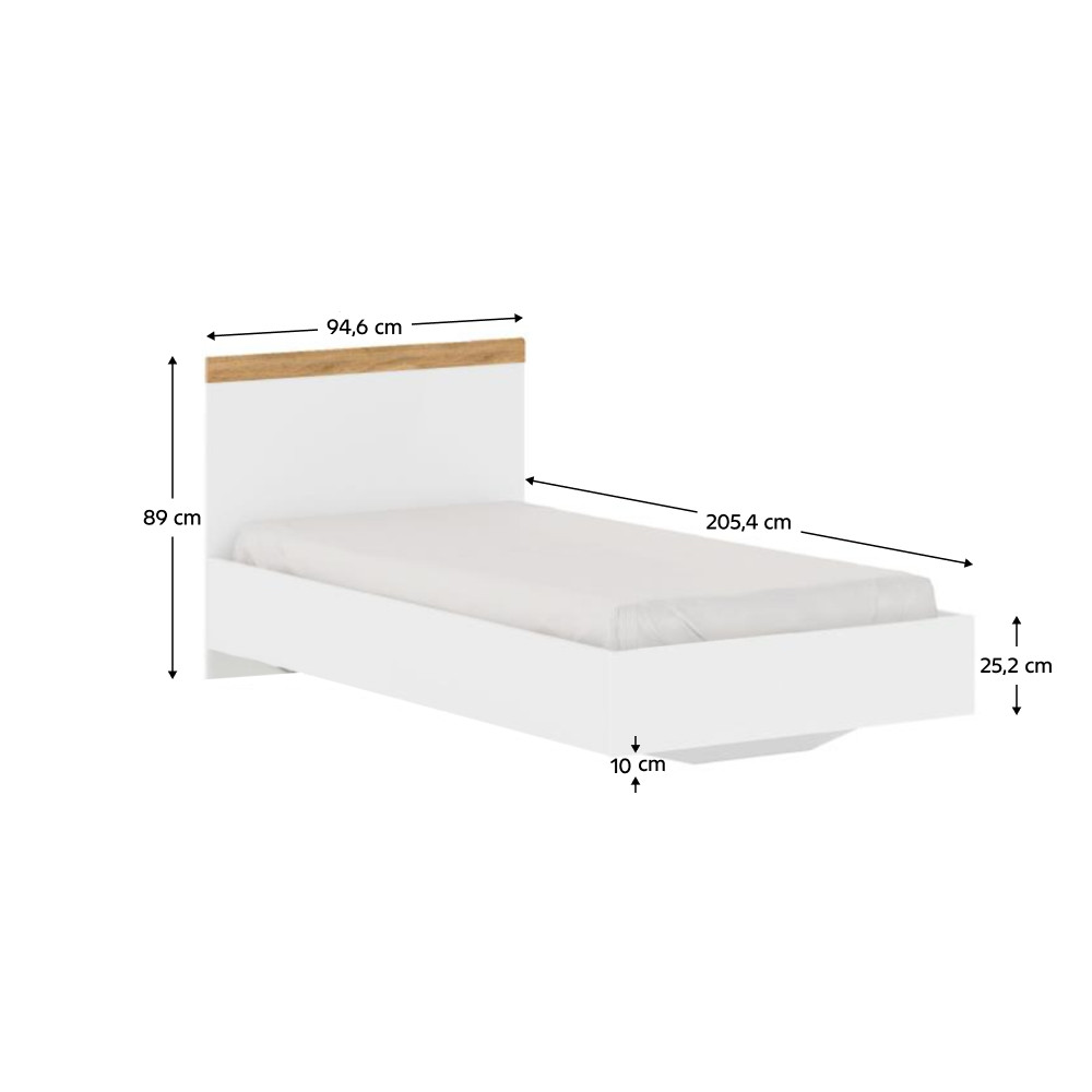 A VILGO ágy letisztult fehér és wotan tölgy kombinációjával minimalista stílust hoz a hálószobába. A 90x200 cm-es alvófelület kényelmes pihenést biztosít, míg az erős laminált DTD szerkezet 90 kg teherbírással bír. A termék matrac és ágyrács nélkül érkezik, így személyre szabottan választhatók ki a kényelmi elemek.