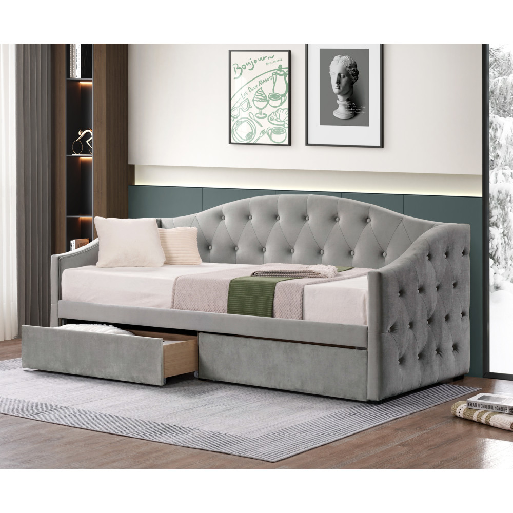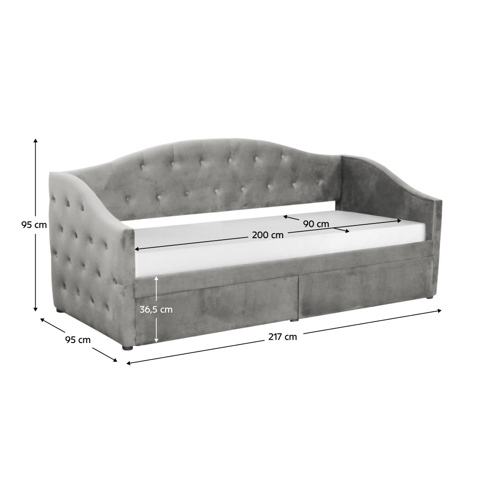 Az elegáns ZASKA ágy szürke Velvet szövetből készült, és tökéletes választás minden modern hálószobába. A 90x200 cm-es alvófelület két praktikus tárolófiókkal rendelkezik, melyek biztosítják a rendezettséget. Az ágy dekoratív varrásai és lábai stílusos megjelenést kölcsönöznek.