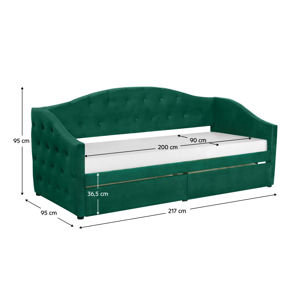 A ZASKA ágy tökéletes választás mindazok számára, akik stílusos és praktikus megoldást keresnek a hálószobájukba. A zöld Velvet szövet eleganciát sugároz, míg a beépített tárolóhelyek két fiók formájában segítenek rendet tartani. Az ágy 90x200 cm-es alvófelülettel rendelkezik, így egy személy számára ideális. A stabil szerkezet és a dekoratívan varrott oldalak a minőségi kidolgozást tükrözik.