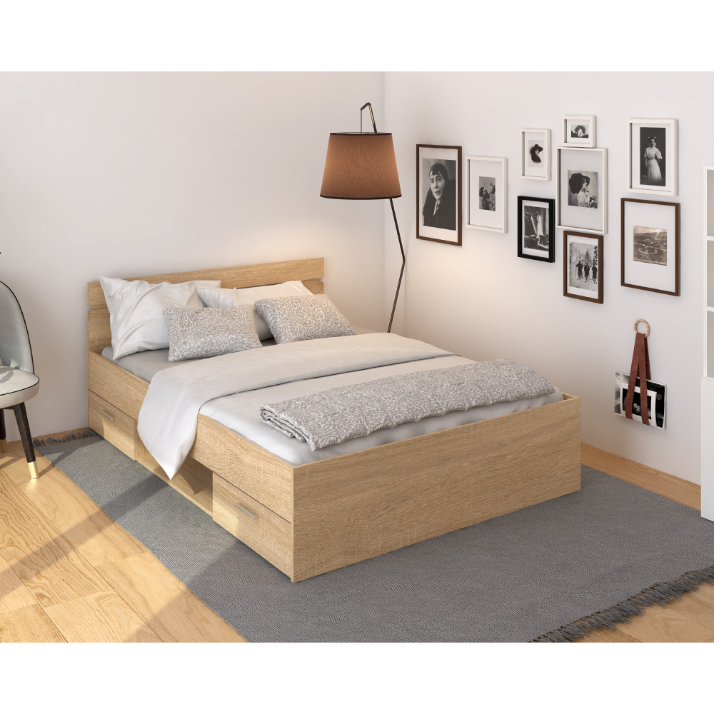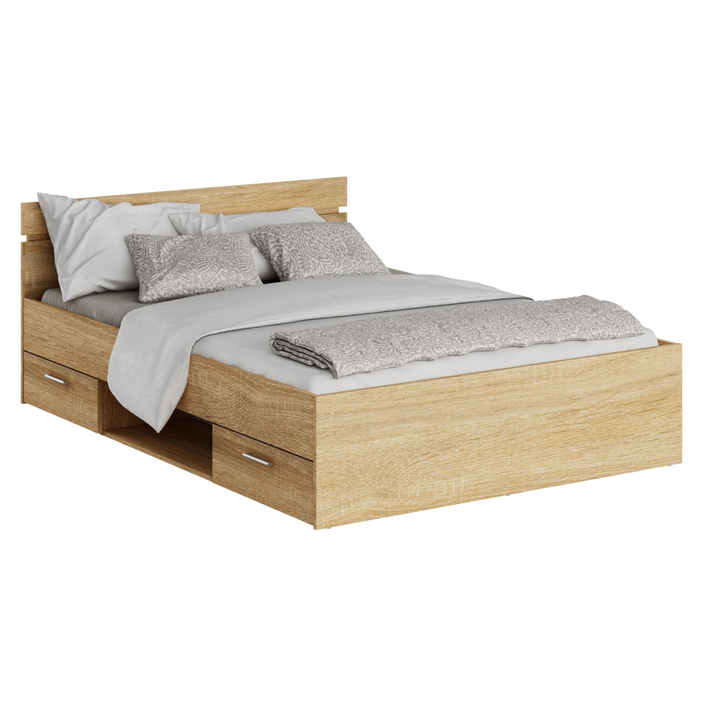 A MICHIGAN NEW ágykeret elegáns és funkcionális választás minden hálószobába. A sonoma tölgyfa színű fóliázott DTD anyagból készült ágykeret 140x200 cm-es fekvőfelülettel rendelkezik, ideális kényelmes alvást biztosítva. Az ágy teherbírása 2x100 kg, így stabil és biztonságos használatot nyújt. Az ágykeret további praktikus eleme a kétoldalról szerelhető két fiók, amelyek ágyneműtartóként is szolgálnak, ezzel megkönnyítve a tárolást.