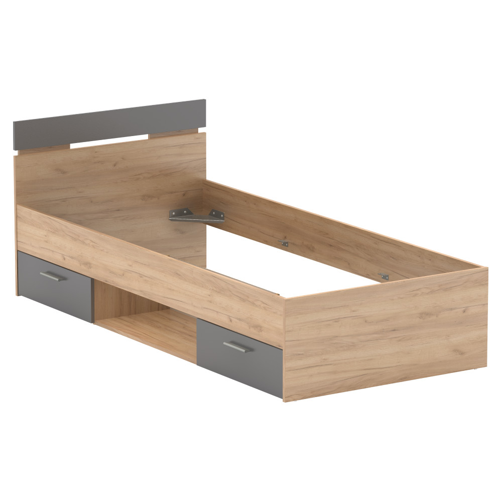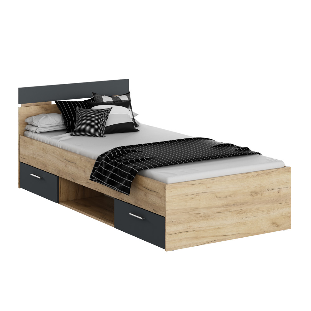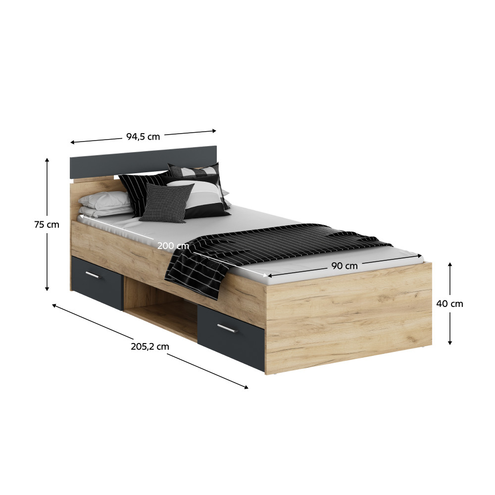 A MICHIGAN NEW ágykeret elegáns megjelenést kölcsönöz hálószobájának az artisan tölgy és grafit színek harmonikus kombinációjával. A 90x200 cm-es fekvőfelület kényelmes alvást biztosít, míg a kétfiókos ágyneműtartó praktikus tárolási lehetőségeket kínál. Az ágykeret 100 kg teherbírású, és alvási magassága 40 cm, így ideális választás minden hálószobához.
