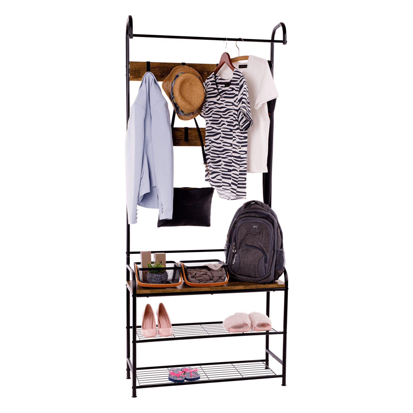 A felső akasztórúd és a több kampó kényelmes helyet biztosít kabátoknak, dzsekiknek, sálaknak és táskáknak, míg az alsó cipőtároló polcokon rendezett módon helyezheted el a mindennap használt lábbeliket. Így minden fontos darab egy helyen, jól átláthatóan és könnyen elérhetően várja a következő indulást.