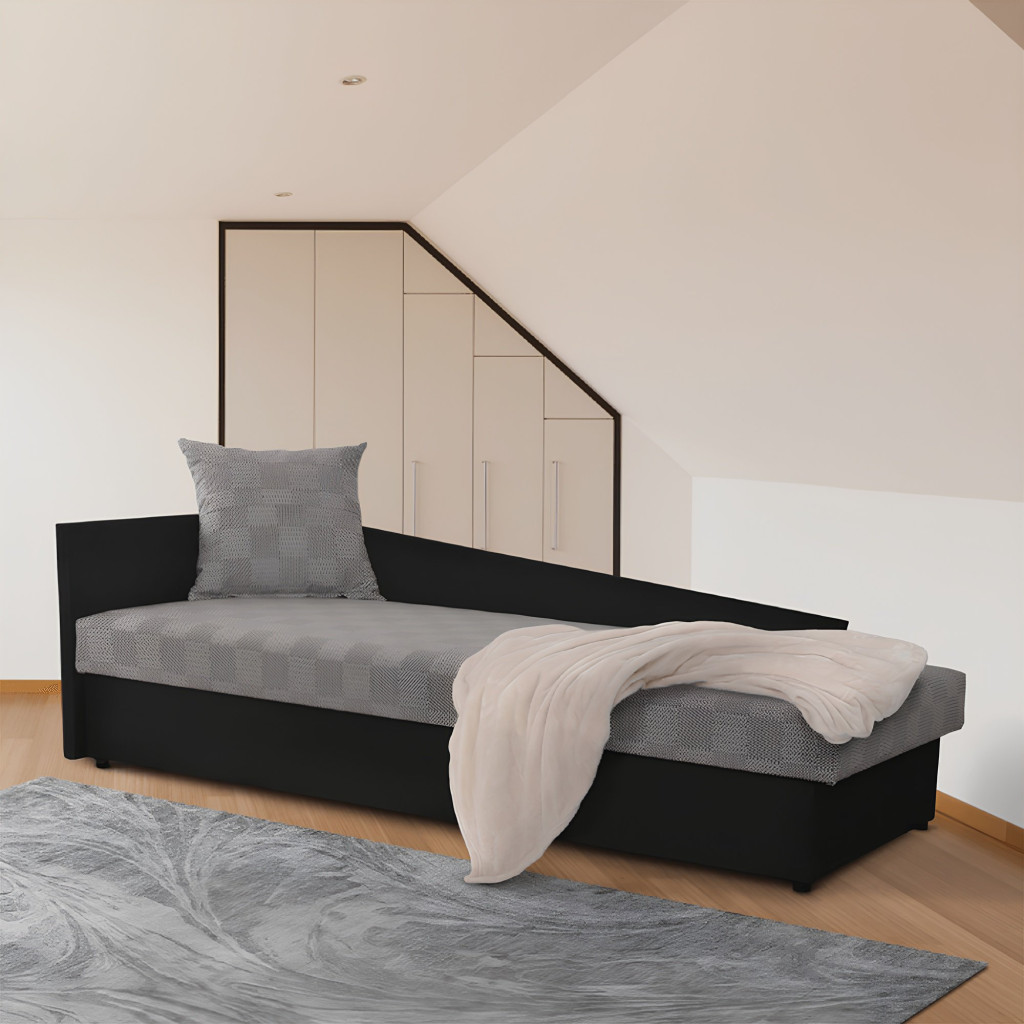 A JUDIT dívány stílusos választás hálószobájába, amely nemcsak helytakarékos, hanem praktikus is a beépített rakodótérnek köszönhetően. A fekete és szürke mintás szövet elegáns megjelenést kölcsönöz, míg a 80 000 Martindale kopásállóság biztosítja a tartósságot. Ideális azok számára, akik értékelik a funkcionalitást és a dizájnt.