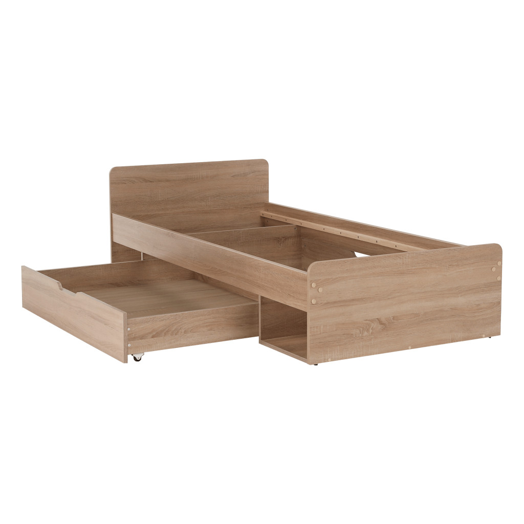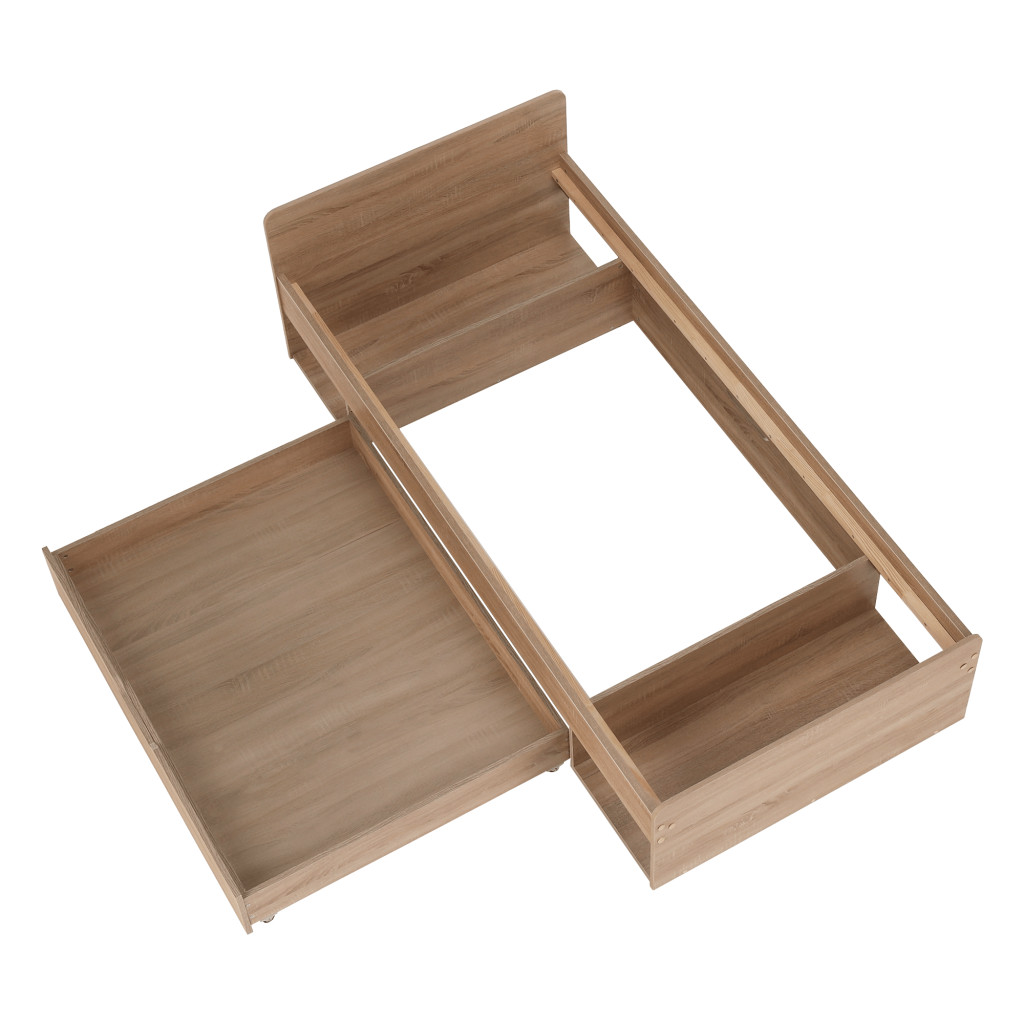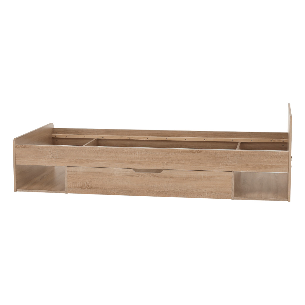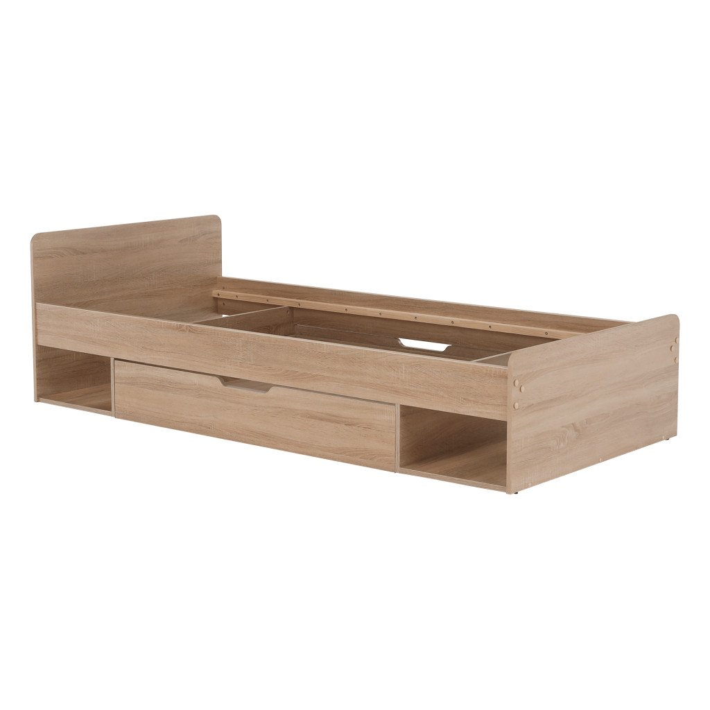 Fedezze fel a TEYO egyszemélyes ágyat, amely sonoma tölgyfa színével és laminált DTD anyagával elegáns megjelenést kölcsönöz hálószobájának. Az ágy méretei 95,6x203,2x60,5 cm, és 90x200 cm-es fekvőfelületet biztosít. Az ágykeret magassága matrac nélkül 36 cm, így kényelmes belépést biztosít.