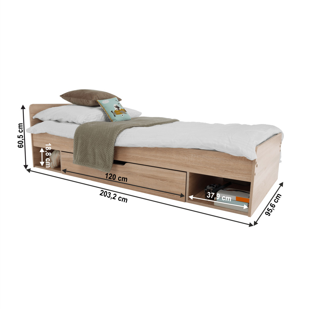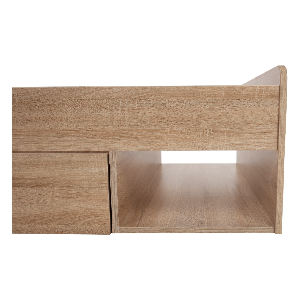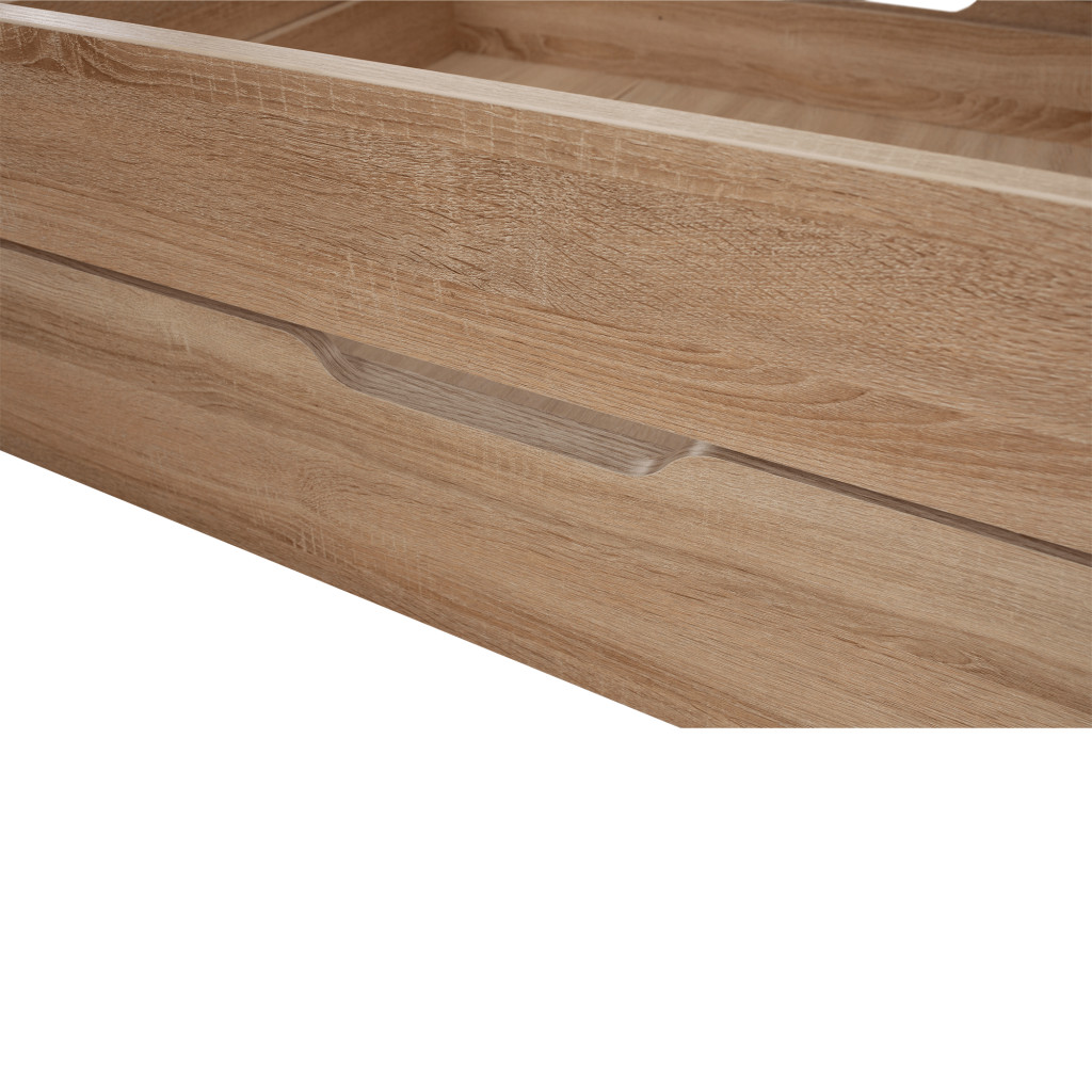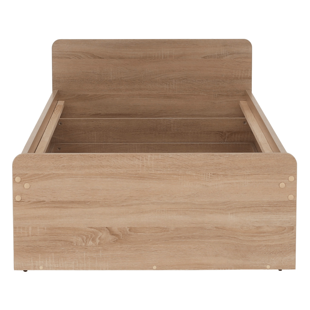 Fedezze fel a TEYO egyszemélyes ágyat, amely sonoma tölgyfa színével és laminált DTD anyagával elegáns megjelenést kölcsönöz hálószobájának. Az ágy méretei 95,6x203,2x60,5 cm, és 90x200 cm-es fekvőfelületet biztosít. Az ágykeret magassága matrac nélkül 36 cm, így kényelmes belépést biztosít.