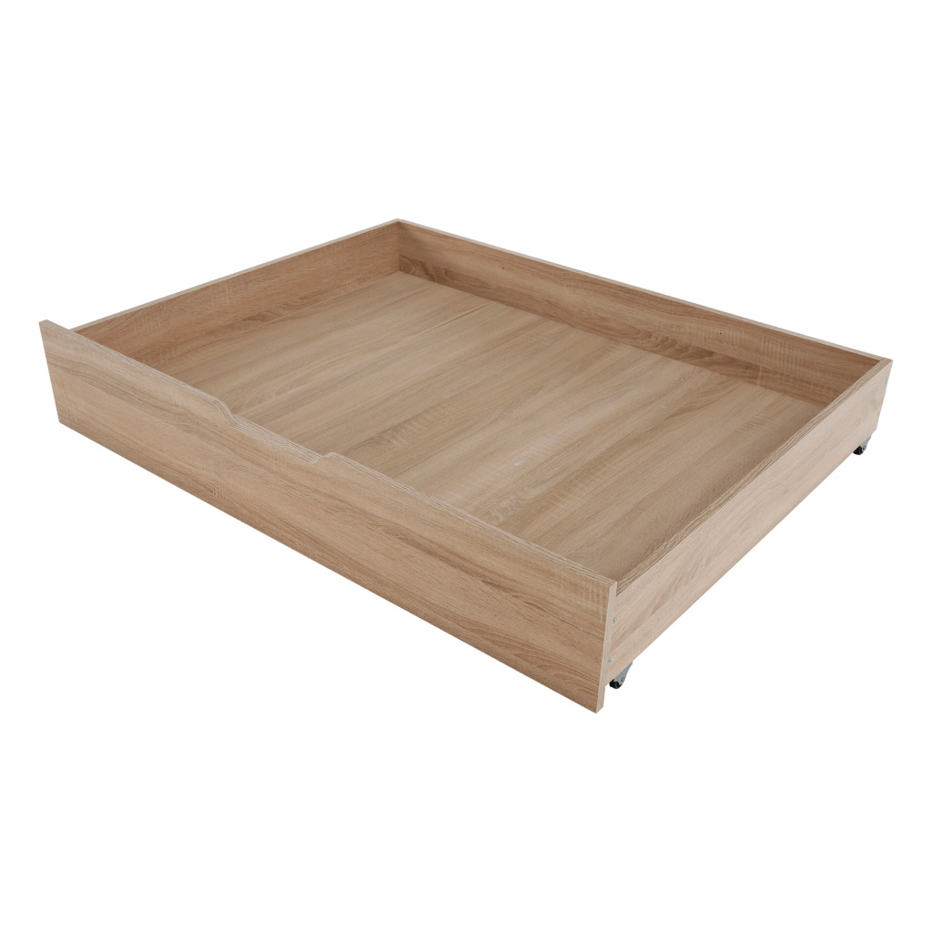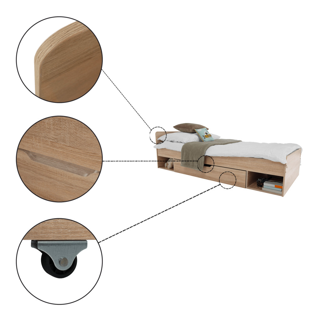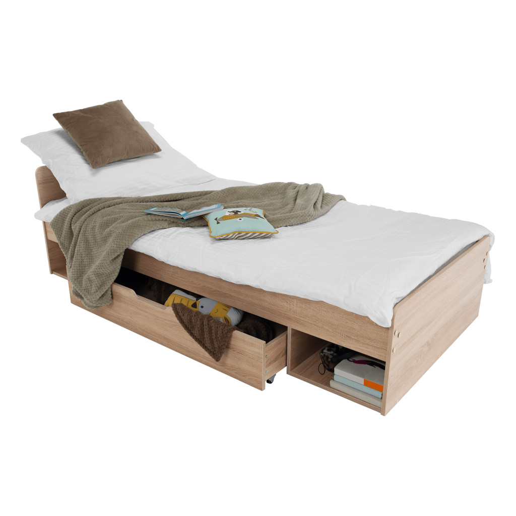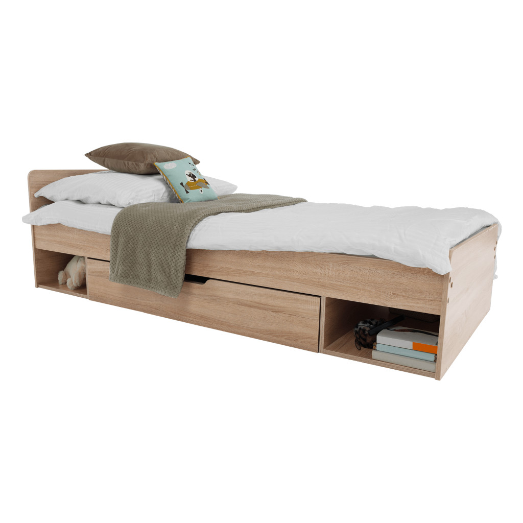 Fedezze fel a TEYO egyszemélyes ágyat, amely sonoma tölgyfa színével és laminált DTD anyagával elegáns megjelenést kölcsönöz hálószobájának. Az ágy méretei 95,6x203,2x60,5 cm, és 90x200 cm-es fekvőfelületet biztosít. Az ágykeret magassága matrac nélkül 36 cm, így kényelmes belépést biztosít.
