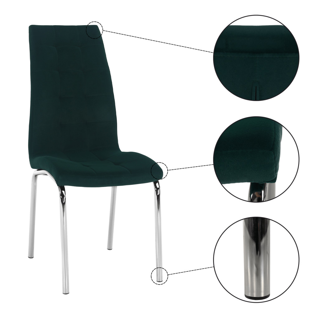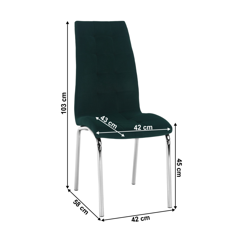 A GERDA NEW étkezőszék elegáns választás bármely modern étkezőbe. Smaragd Velvet szövete luxus érzetet kelt, míg króm lábai stabilitást és stílust biztosítanak. Tökéletesen kombinálja a kényelmet és a dizájnt, hogy minden étkezés különleges legyen.