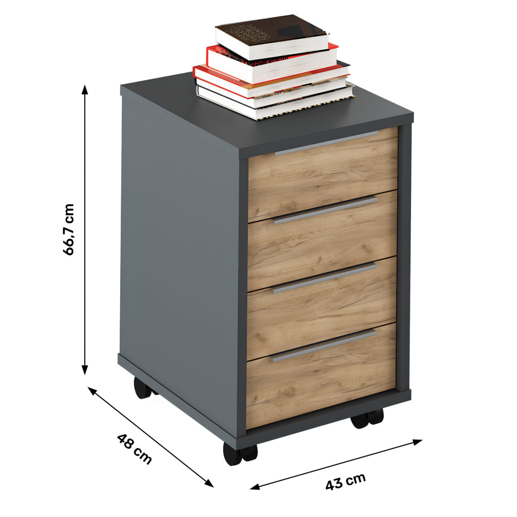 A RIOMA NEW TYP 14 irodai konténer elegáns megjelenésével és praktikus funkcióival ideális választás minden modern iroda számára. Grafit színű külsője és tölgyfa artisan részletei tökéletesen illeszkednek a kortárs irodabútorokhoz, miközben a három tágas fiók elegendő tárolóhelyet biztosít a mindennapi irodai eszközök számára. A strapabíró kialakítás és a kiváló minőségű anyagok garantálják a hosszú távú használatot.