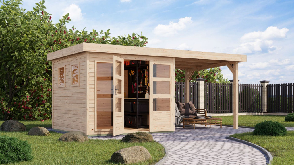 Karibu Lahar 3.5 Lapostetős kerti ház, bővítménnyel/terasszal, natúr fából 463 cm x 246 cm