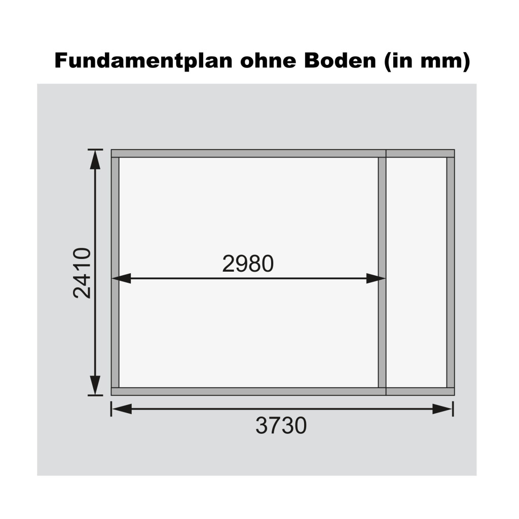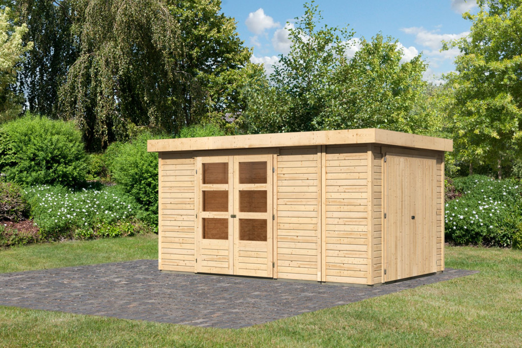 Karibu Retola 6. Lapostetős nagyméretű kerti ház beépített oldalsó tárolóval, natúr fából 377 cm x 246 cm