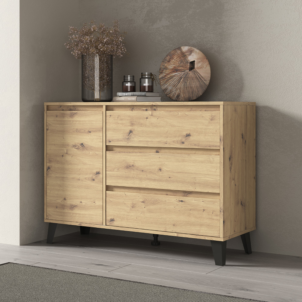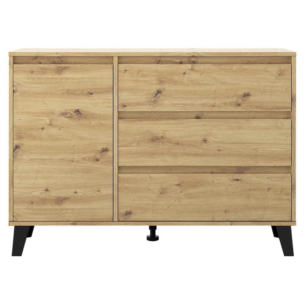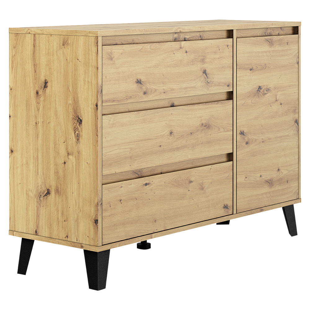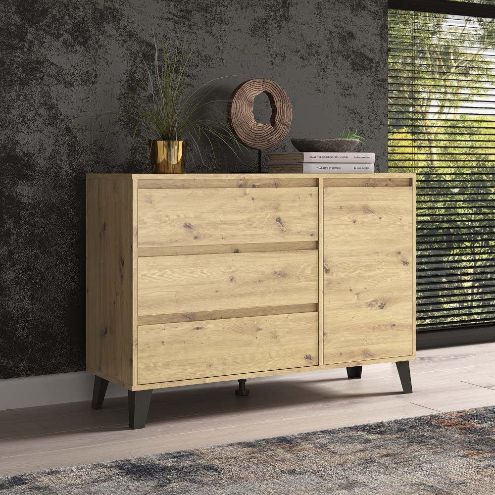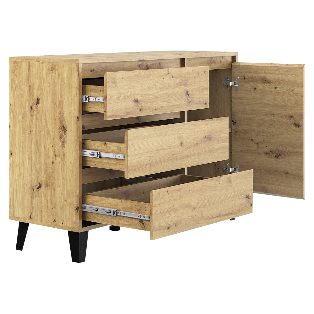 A BOGAN NEW 1D3S komód kiváló választás azoknak, akik egyszerre keresnek praktikusságot és esztétikai élményt. Az artisan tölgy furnér melegséget sugároz, miközben a három fiókos és egy ajtós kialakítás bőséges tárolóhelyet biztosít. Ideális választás nappalikba vagy hálószobákba, ahol fontos a rendezett megjelenés.