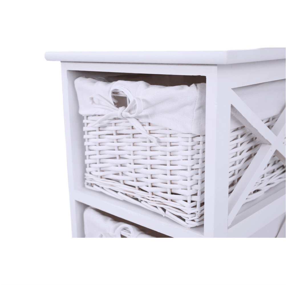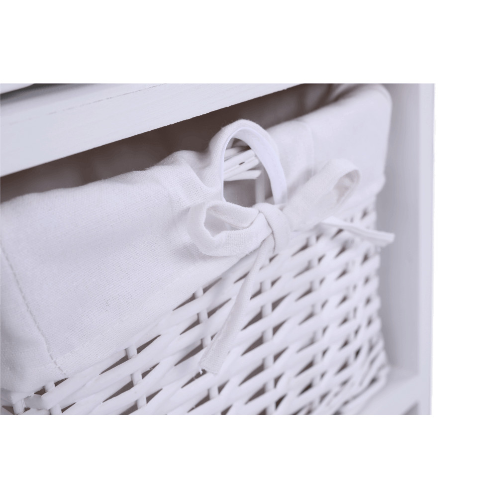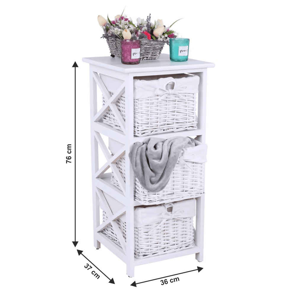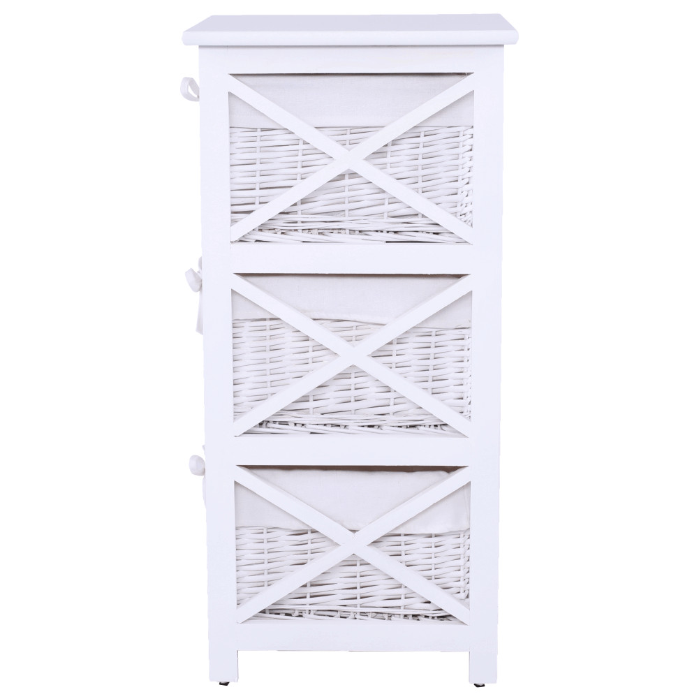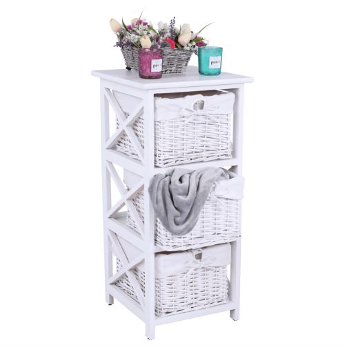 A RAFAELLO 3 komód ideális választás, ha stílusos és praktikus tárolási megoldást keres hálószobájába. A fehér szín elegáns megjelenést kölcsönöz, míg a fa, vesszőfonás és szövet kombinációja biztosítja a tartósságot és az esztétikát. A három kosár bőséges helyet kínál a mindennapi tárgyak rendezett tárolására.