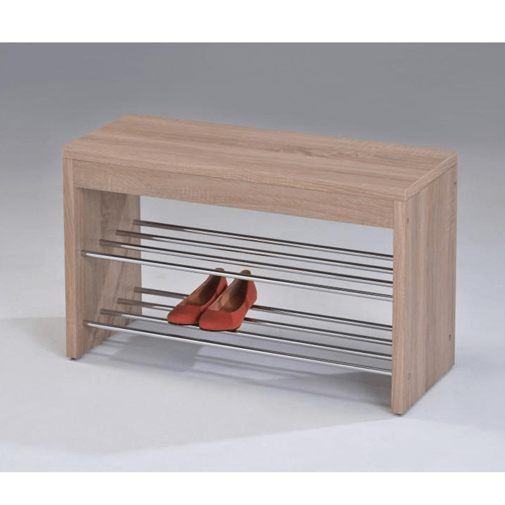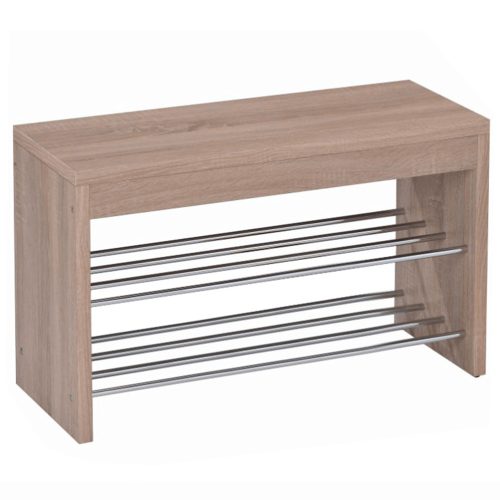 A tölgy sonoma felület természetes, világos faerezetet idéz, amely barátságosabbá teszi az előszobát, miközben vizuálisan nem nehezíti el a teret. A króm színű fém cipőtartó rudak modern kontrasztot adnak, így a lóca jól mutat minimalista, skandináv vagy klasszikusan visszafogott környezetben is.