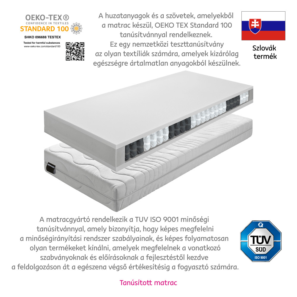 A BE TEXEL ALERGIK NEW matrac a tökéletes választás azok számára, akik közepesen kemény alátámasztásra vágynak. Táskarugós kialakítása biztosítja a megfelelő nyomáselosztást és gerinctámaszt, míg a levehető, Chloe Aktiv huzat OEKO-TEX STANDARD tanúsítvánnyal garantálja a higiénikus és kényelmes alvást. Ideális választás 70 és 120 kg közötti személyek számára.