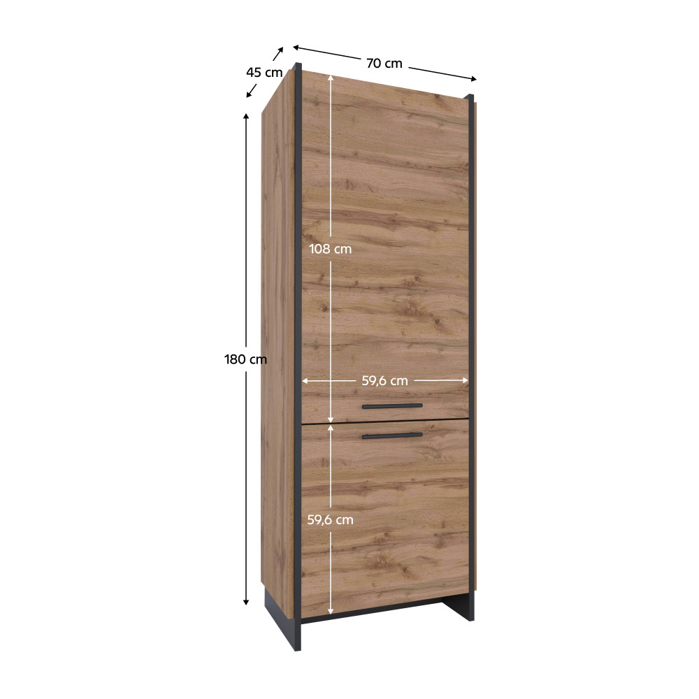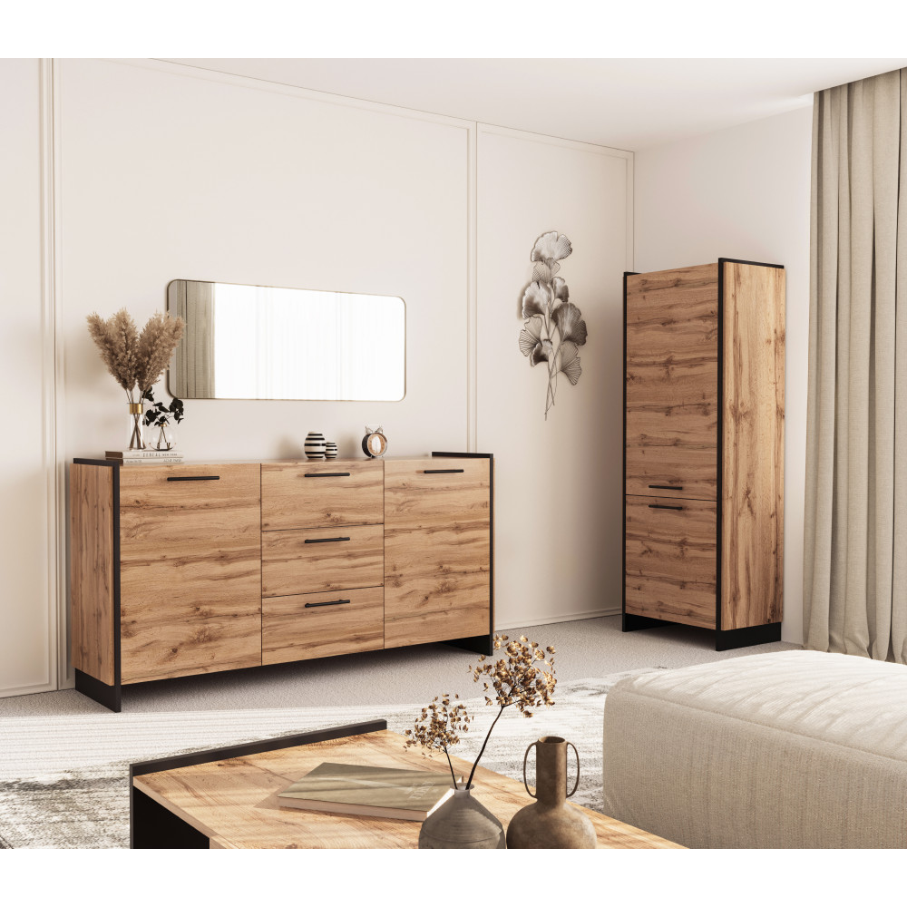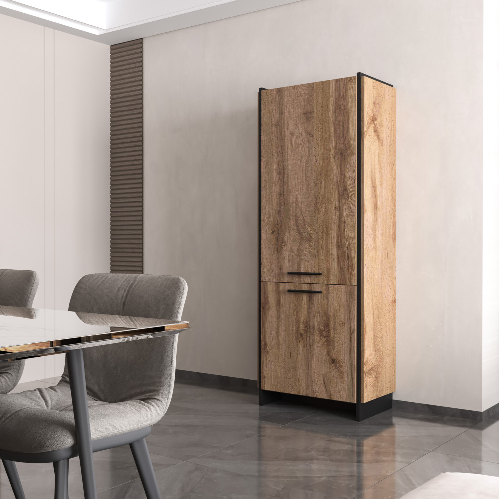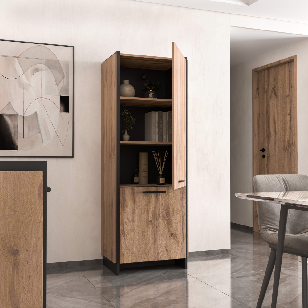Az AMONI 2D polcos szekrény elegáns megjelenése és praktikus kialakítása révén tökéletes választás minden modern nappali számára. A wotan tölgy és fekete színkombináció egyedi dizájnt kölcsönöz, miközben a tágas polcok bőséges tárolóhelyet biztosítanak könyveinek, dísztárgyainak vagy egyéb személyes tárgyainak.