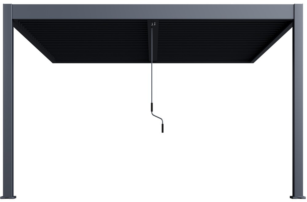 A Rojaplast INTRO DUO 4×4 m bioklimatikus pergola prémium megoldást kínál azoknak, akik elegáns, modern és tartós fedést szeretnének kültéri pihenőhelyük fölé. Ez a falhoz rögzíthető alumínium pergola ideális választás teraszokra, kertekbe vagy udvarokra, hiszen védelmet nyújt a napsütés, az eső és a szél ellen, miközben stílusosan egészíti ki a környezetet.A masszív, antracit színű (RAL 7016), matt felületkezelésű alumínium szerkezet rendkívül stabil és időjárásálló. A tető 50 alumínium lamellából áll, amelyek két külön zónára osztva, egymástól függetlenül szabályozhatók. A lamellák 0°–135° között állíthatók, így teljes zárásnál vízzáró fedést adnak, félig nyitva szellőzést biztosítanak, nap felé fordítva beengedik a fényt, a naptól elfelé döntve pedig árnyékot teremtenek.A lamellák egyszerűen, kézi karral működtethetők. A kar kialakítása megakadályozza a pergola karcolódását, és eltávolítható, hogy ne akadályozza a kiegészítők – például árnyékoló oldalpanelek vagy szélfogó előlapok – használatát.A pergola speciális integrált vízelvezető rendszerrel van ellátva, amely óránként akár 17 l/m² esővizet képes elvezetni a szerkezet belsejében. Télen a lamellákat függőleges állásban kell hagyni, de rövid ideig akár 30–40 cm hóterhet (kb. 50 kg/m²) is elbírnak.