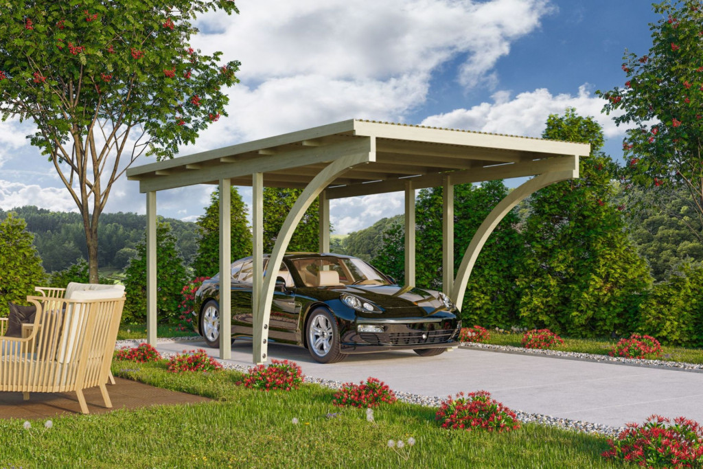 Karibu Basic 1. egyállásos fa autóbeálló, fedett kocsibeálló, boltíves bejárattal, 268 cm x 387 cm