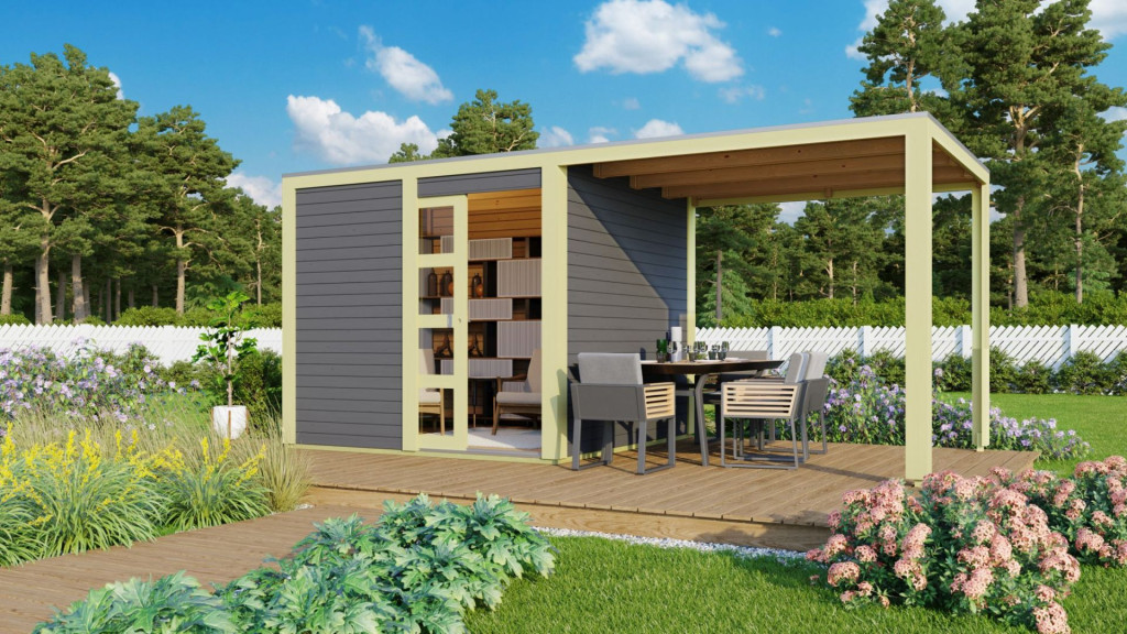 Karibu Qubic 1. Lapostetős modern medenceház, kerti tároló, ház bővítménnyel/terasszal, terra szürke színű fából 485 cm x 246 cm