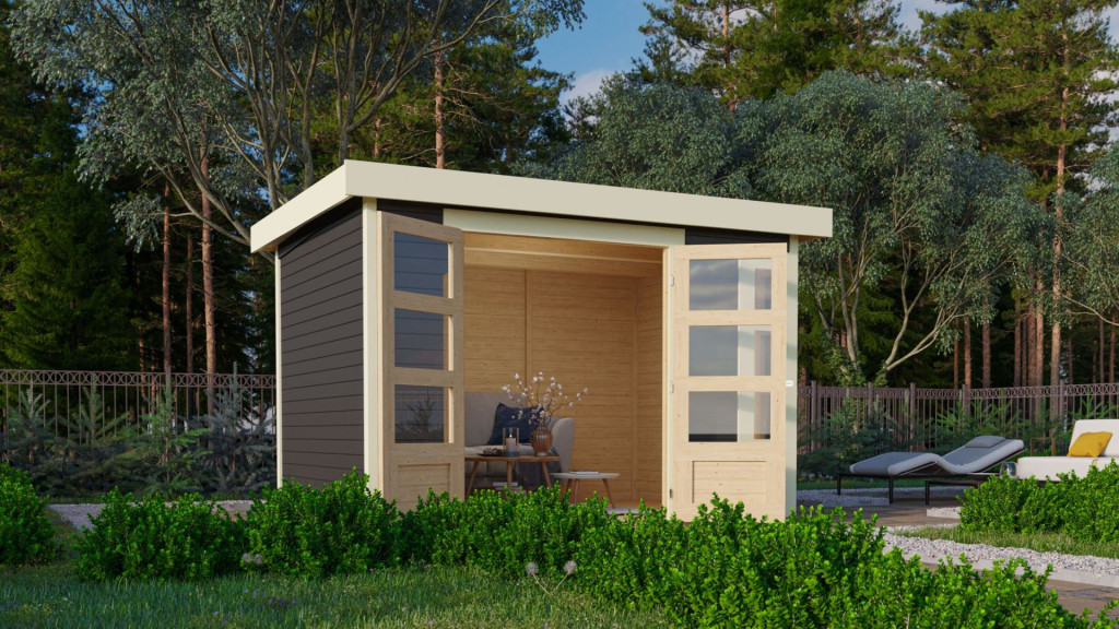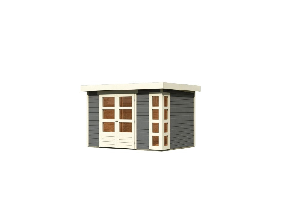 Karibu Kerko 4. Lapostetős kerti ház, modern sarokablakkal, terra szürke színű fából 302 cm x 217 cm