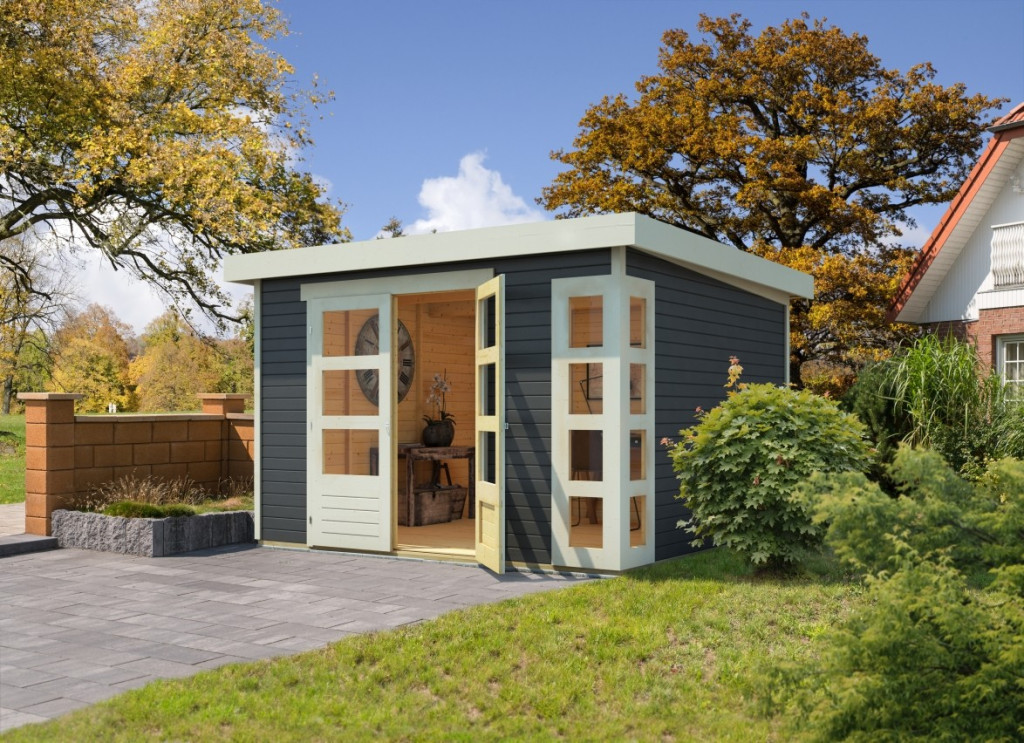 A Karibu Kerko 6 kerti ház natúr fa kivitelben vagy elegáns terra szürke színben is elérhető, így könnyedén illeszthető bármilyen kert stílusához. A nagy méretű, nyolc fix üvegtáblával ellátott sarokablak nemcsak esztétikai elem, hanem praktikus megoldás is, hiszen világos, barátságos belső teret biztosít.