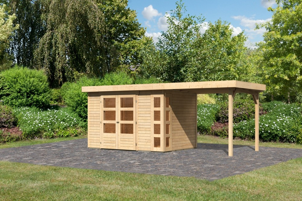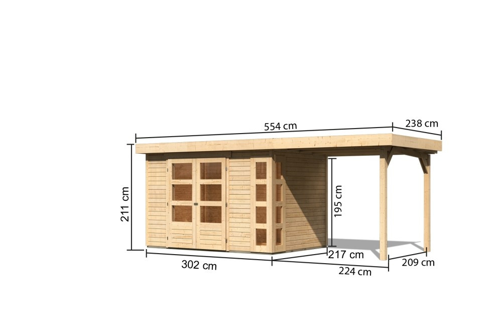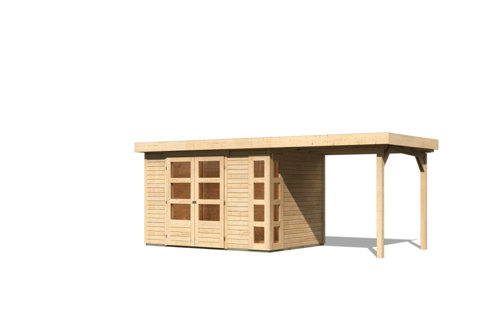 Karibu Kerko 4. Lapostetős kerti ház, modern sarokablakkal, bővítménnyel/terasszal natúr fából 522 cm x 217 cm