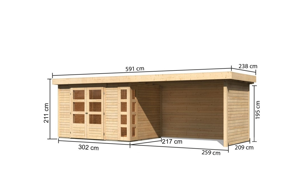 Karibu Kerko 4. Lapostetős kerti ház, modern sarokablakkal, oldal- és hátfallal rendelkező bővítménnyel/terasszal natúr fából 561 cm x 217 cm