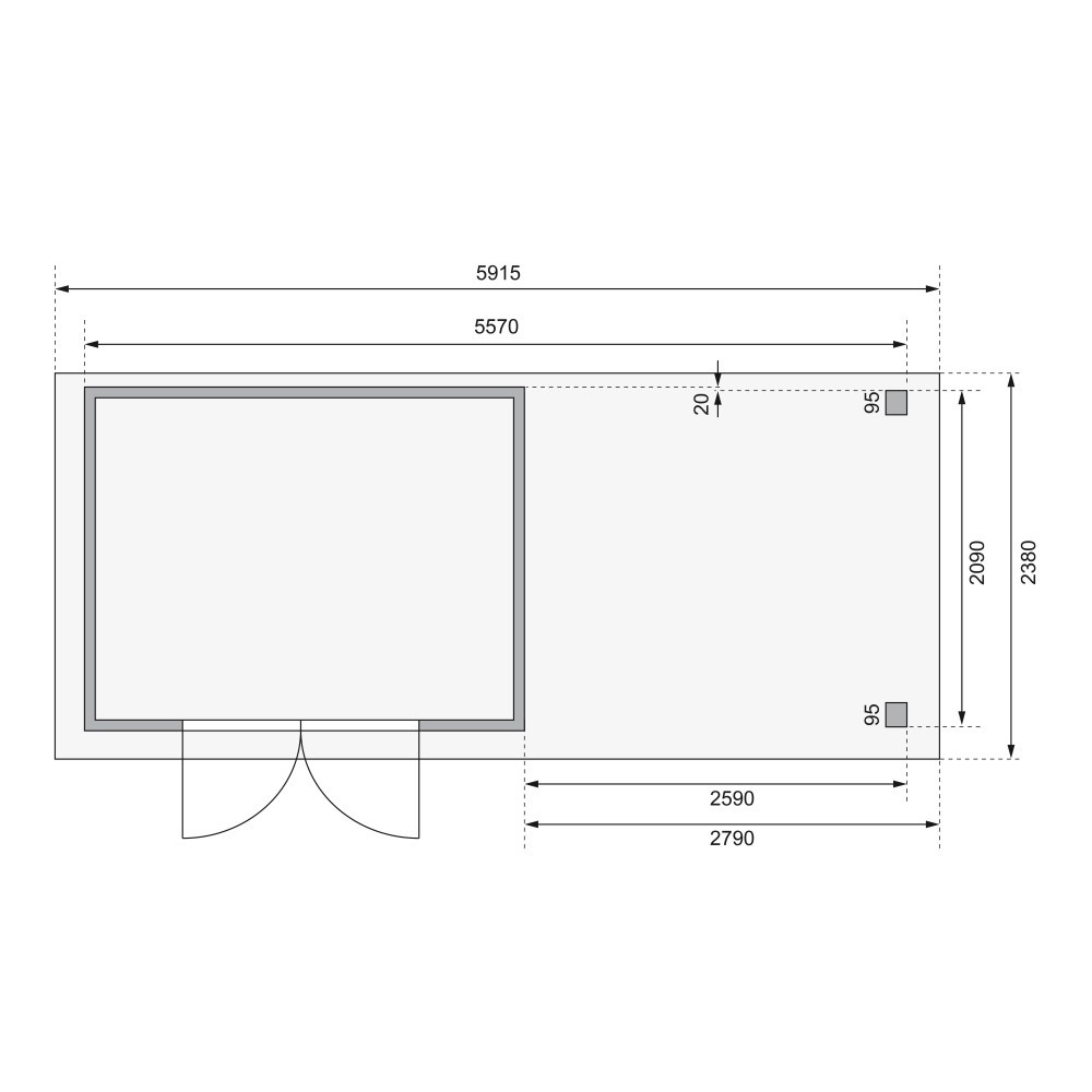 Karibu Kerko 4. Lapostetős kerti ház, modern sarokablakkal, oldal- és hátfallal rendelkező bővítménnyel/terasszal terra szürke színű fából 561 cm x 217 cm