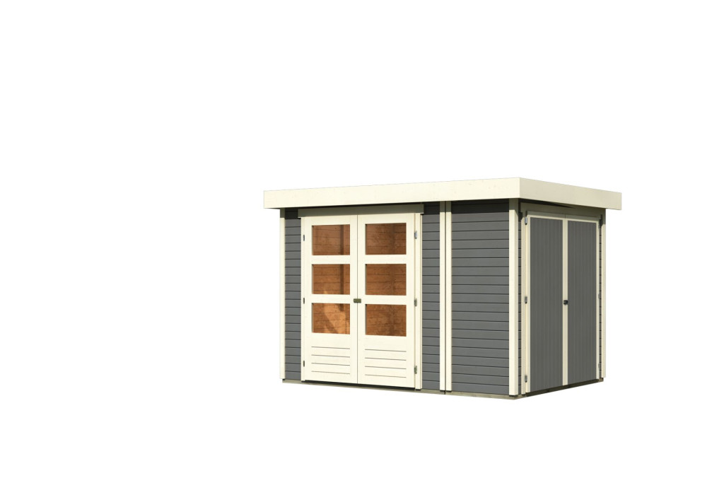 Karibu Retola 2. Lapostetős kerti ház beépített oldalsó tárolóval, terra szürke színű fából 288 cm x 217 cm