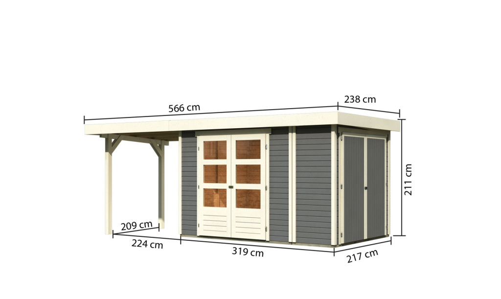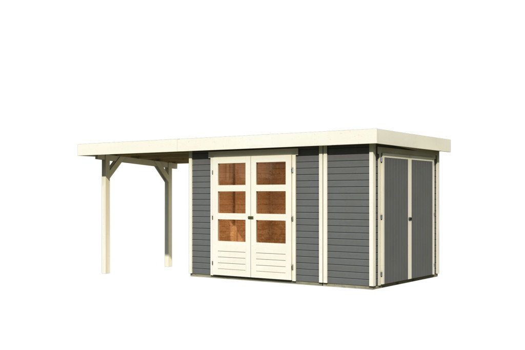 Karibu Retola 3. Lapostetős kerti ház beépített oldalsó tárolóval, bővítménnyel/terasszal terra szürke színű fából 537 cm x 217 cm