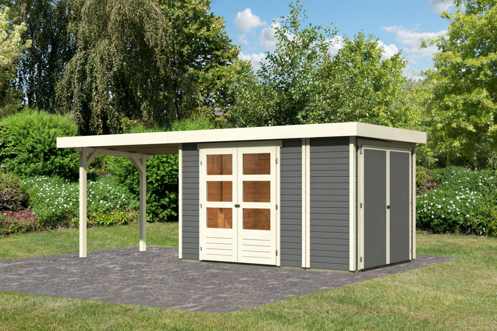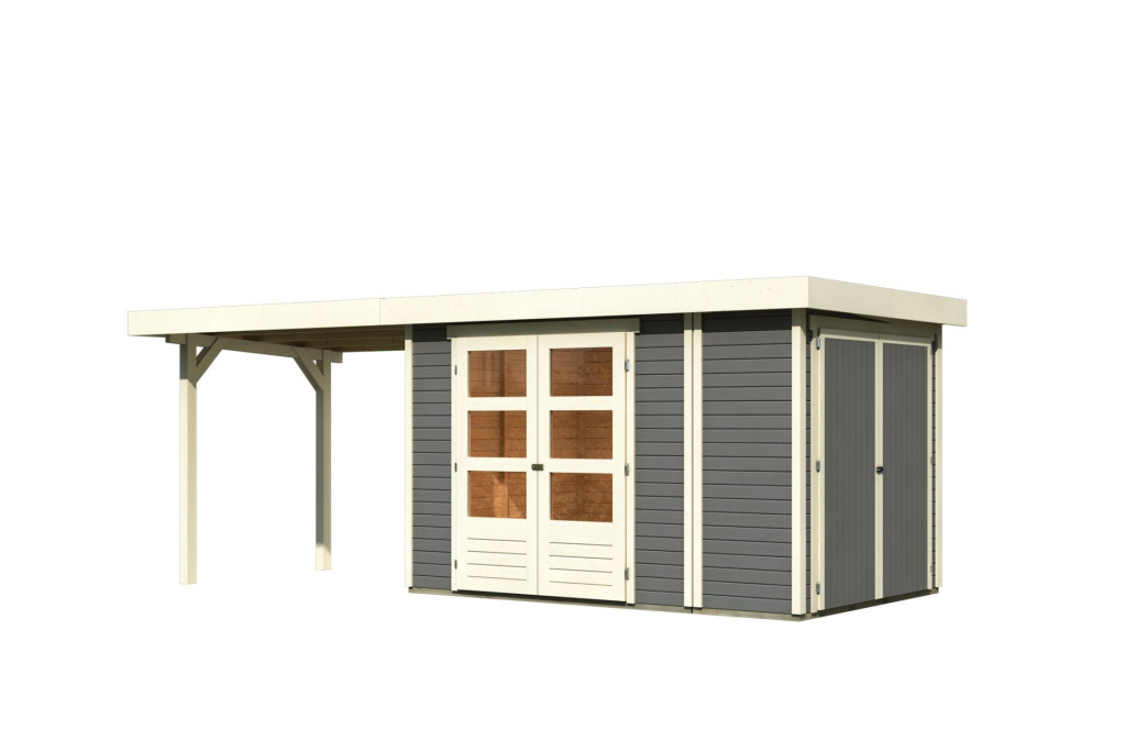 Karibu Retola 3. Lapostetős kerti ház beépített oldalsó tárolóval, bővítménnyel/terasszal terra szürke színű fából 572 cm x 217 cm