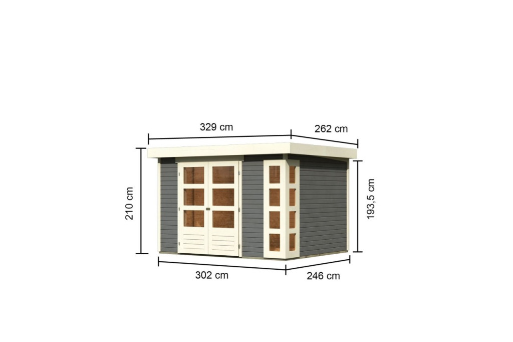 Karibu Kerko 5. Nagyméretű lapostetős kerti ház, modern sarokablakkal, terra szürke színű fából 302 cm x 246 cm