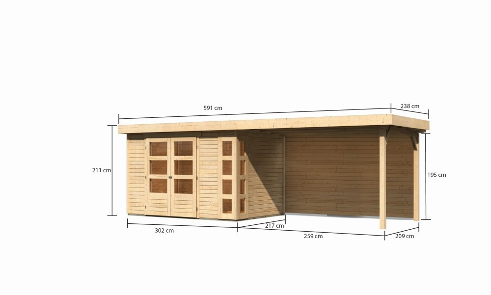 A modern sarokablak nyolc fix üvegtáblával rendelkezik, amely maximális fénybeáramlást biztosít. Ennek köszönhetően a belső tér világos, kellemes hangulatú és jól kihasználható. A 302 x 217 cm-es külső méret elegendő helyet nyújt kerti szerszámok, bútorok vagy akár sporteszközök tárolására is.