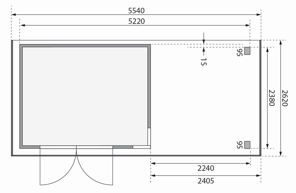 Karibu Kerko 5. Nagyméretű lapostetős kerti ház, modern sarokablakkal, hátfallal rendelkező bővítménnyel/terasszal, terra szürke színű fából 522 cm x 246 cm