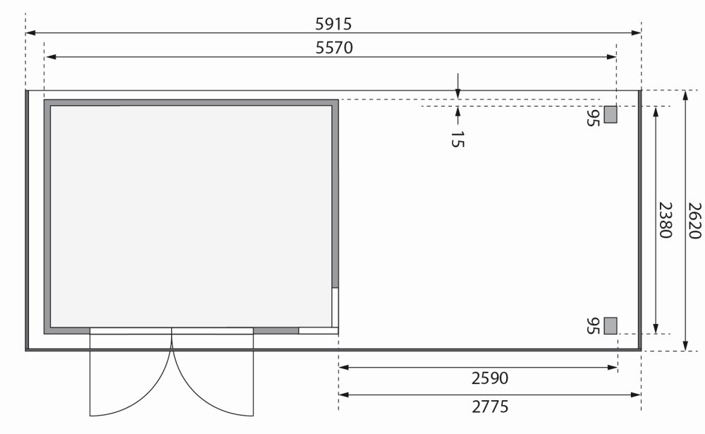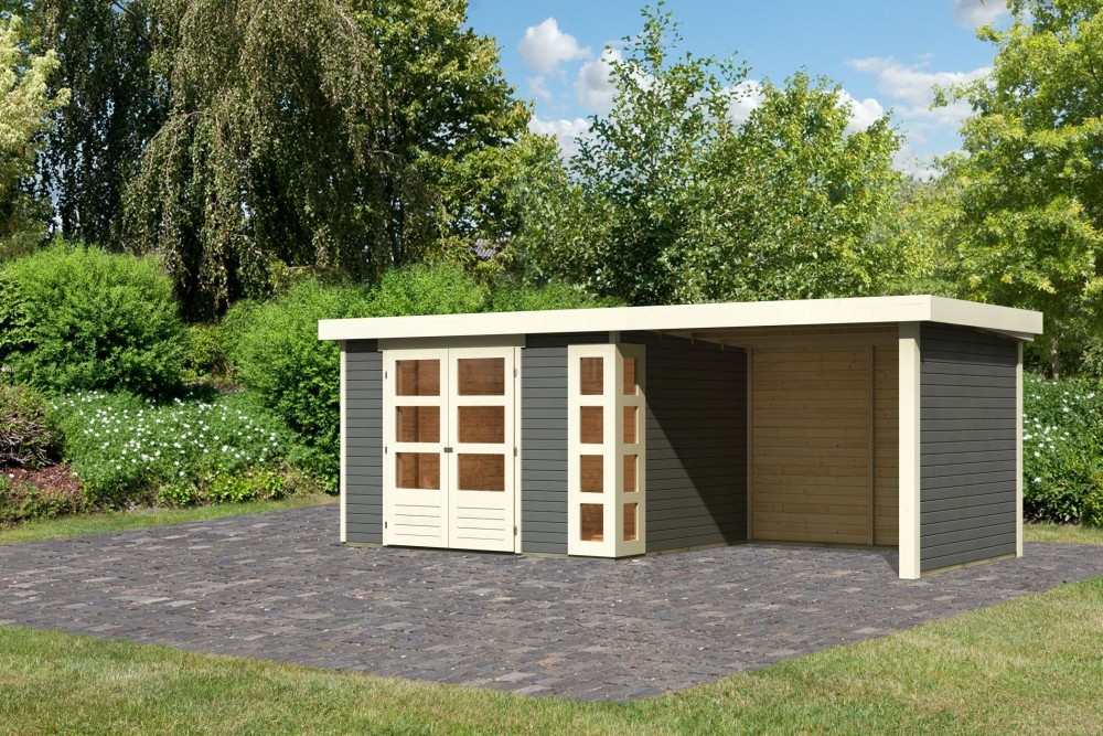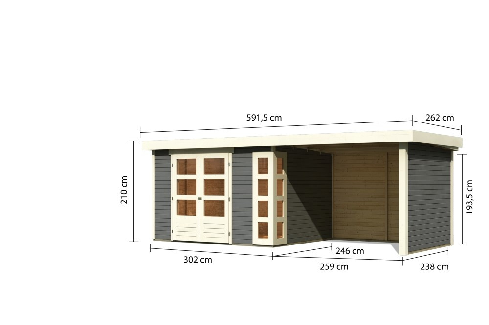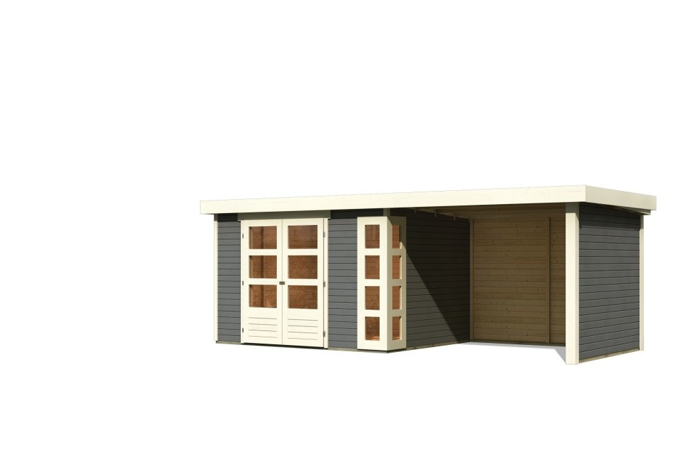 Karibu Kerko 5. Nagyméretű lapostetős kerti ház, modern sarokablakkal, oldal- és hátfallal rendelkező bővítménnyel/terasszal, terra szürke színű fából 557 cm x 246 cm