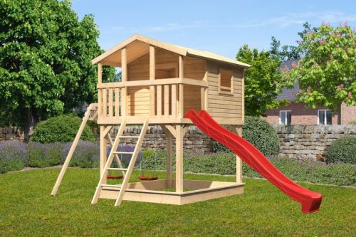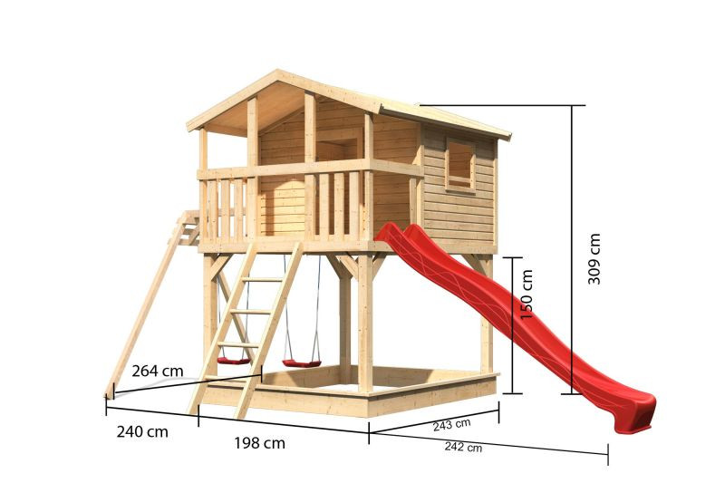 A teraszra való feljutást erős falétra segíti, míg a beépített homokozó még változatosabb játékélményt kínál. A 198 x 244 x 309 cm méretű játszóház bőséges teret biztosít több gyermek egyidejű játékához is.